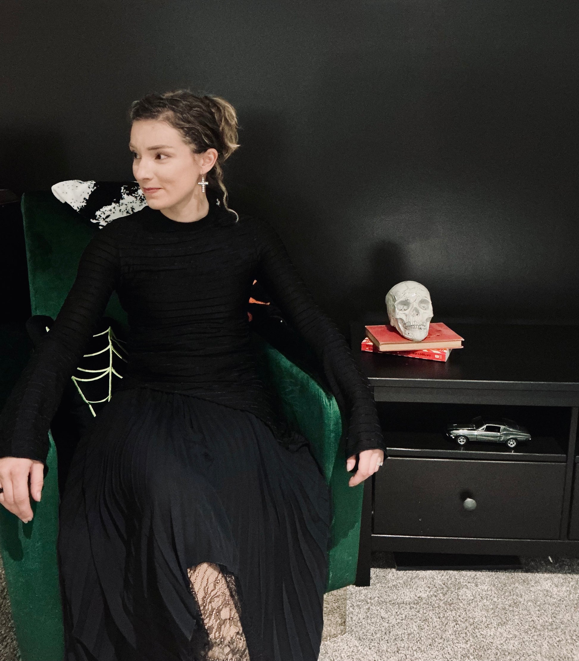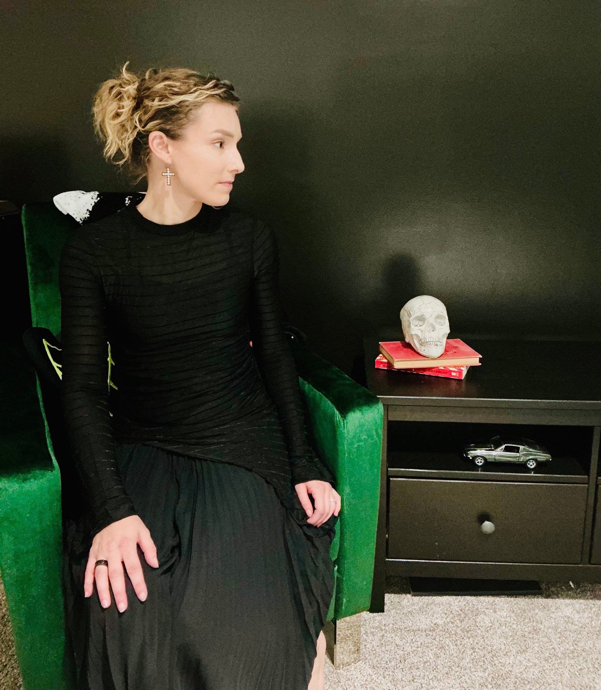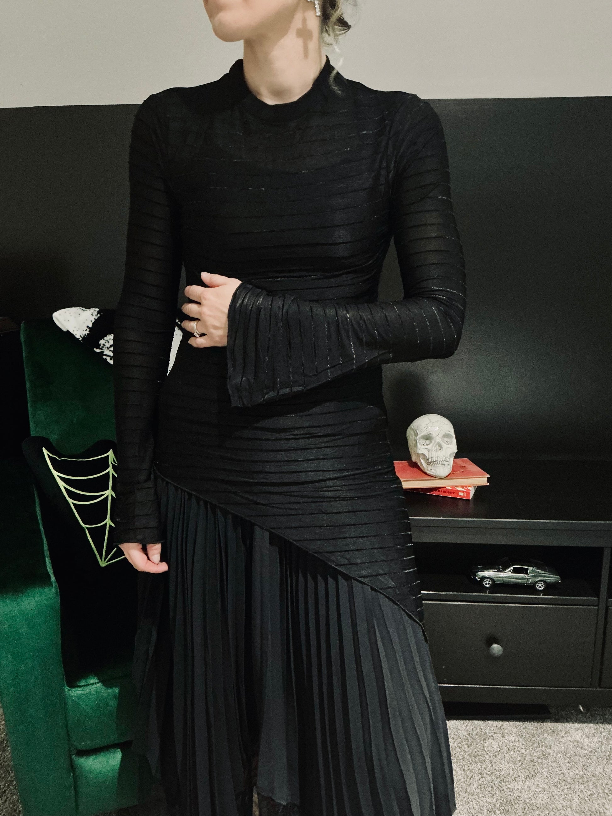 - Long, slightly flared sleeves